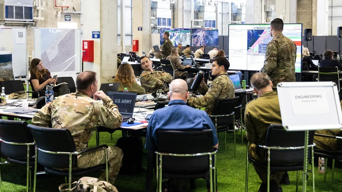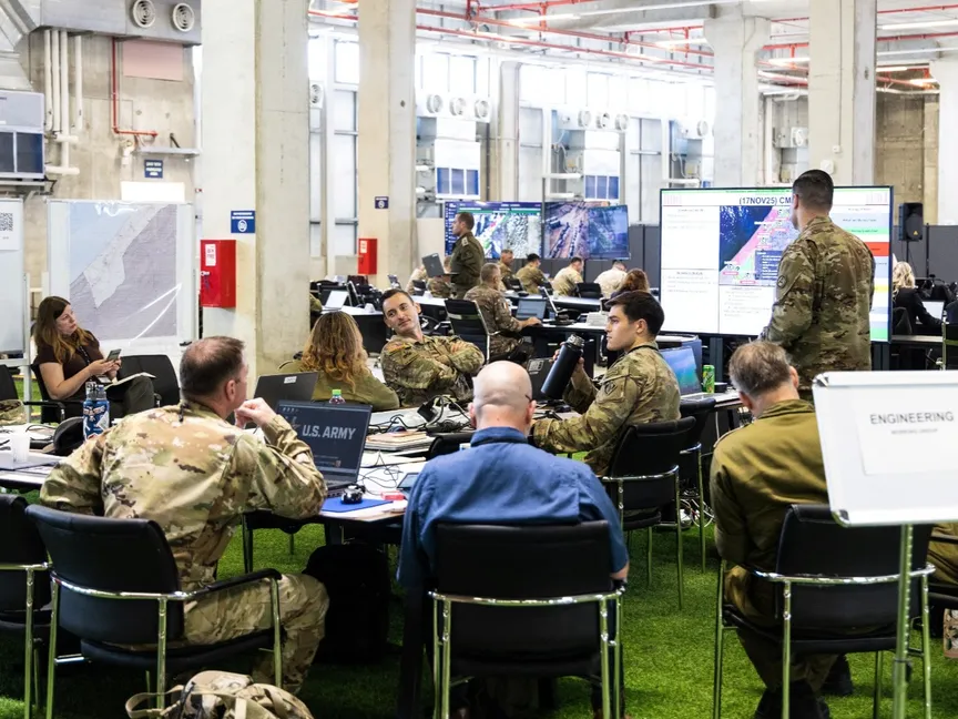 جنود أميركيون وإسرائيليون يجتمعون في مركز التنسيق المدني-العسكري في بلدة كريات جات جنوب إسرائيل. 17 نوفمبر 2025 - الشرق