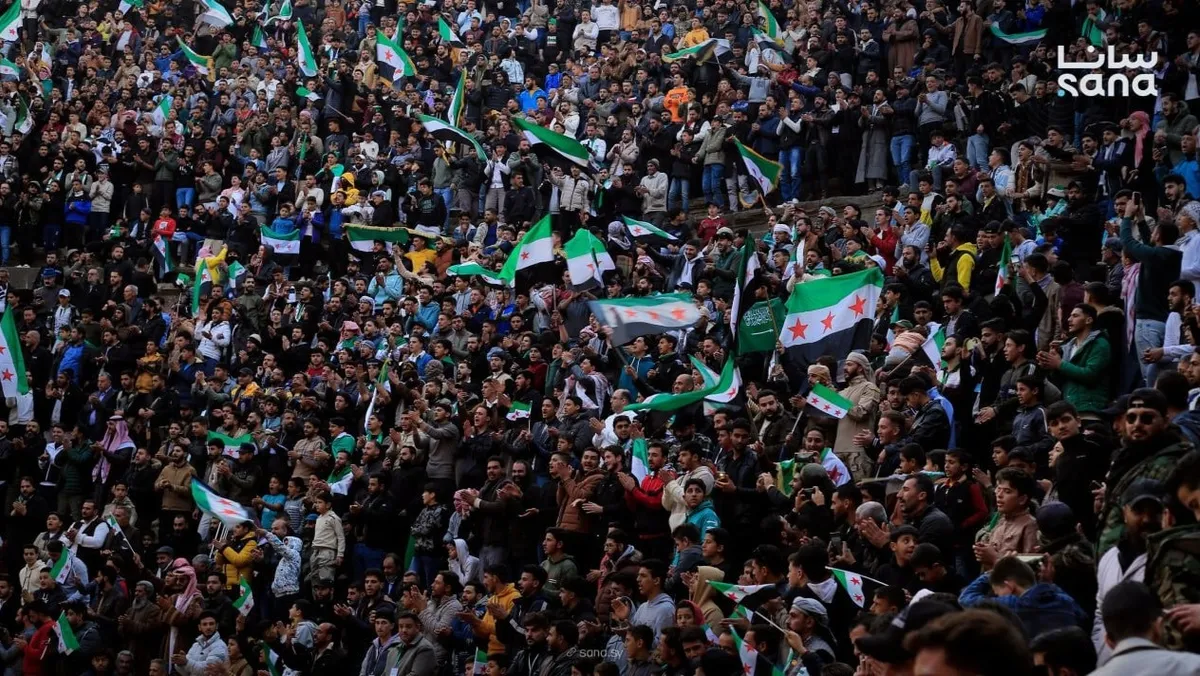 الآلاف يشاركون في مهرجان "نصر حوران" بمدرج بصرى الشام الأثري في مدينة درعا بمناسبة ذكرى التحرير في سوريا. 7 ديسمبر 2025 - سانا