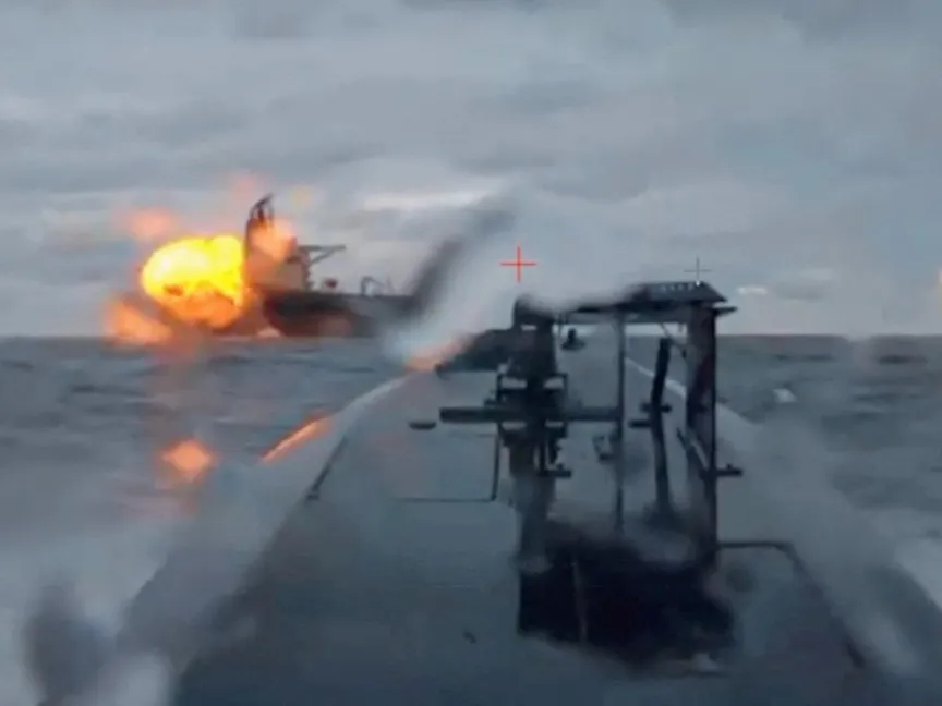 ناقلة تابعة لما يسمى "أسطول الظل" الروسي تتعرض لضربة من زورق بحري مُسير في البحر الأسود. 10 ديسمبر 2025 - Reuters