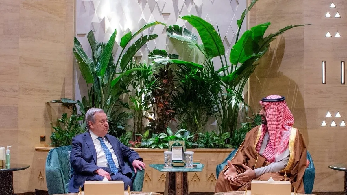 التقى ولي العهد السعودي الأمير محمد بن سلمان الأربعاء، الأمين العام للأمم المتحدة أنطونيو جوتيريش في قصر اليمامة بالرياض، وفق ما ذكرت وكالة الأنباء السعودية (واس).