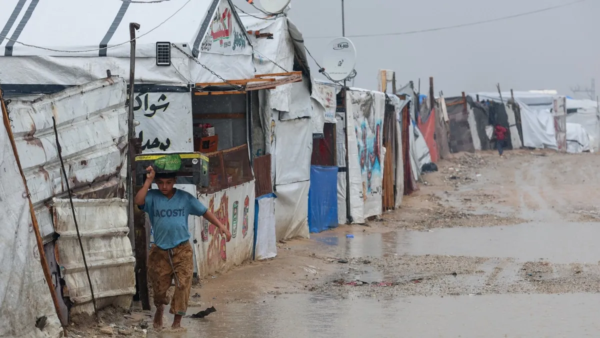 قالت سابرين قديه، المقيمة في مخيم خان يونس بمنطقة المواصي المكتظة، إن عائلتها "استيقظت على تسرب مياه الأمطار من سقف خيمتهم، ومياه الشارع التي غمرت فرشهم".