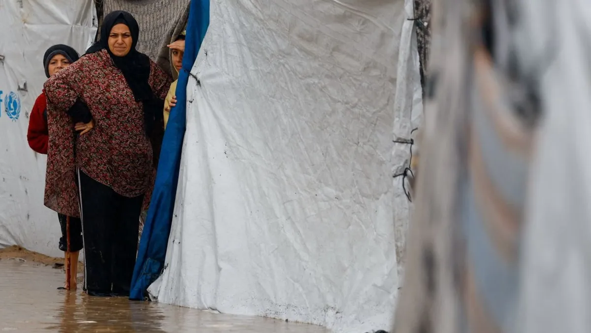 عائلة فلسطينية نازحة تراقب مياه الأمطار التي أغرقت المخيمات في منطقة النصيرات بشمال قطاع غزة. 12 ديسمبر 2025 - REUTERS