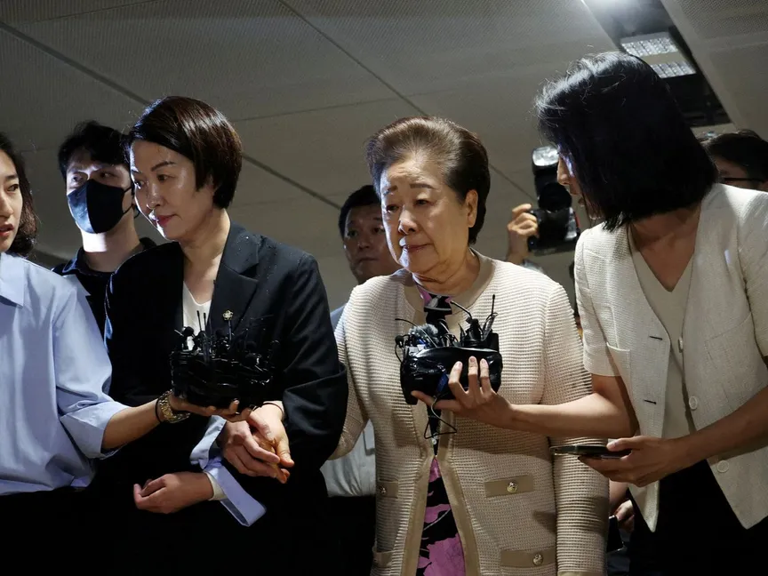 هان هاك-جا، زعيمة كنيسة التوحيد تصل إلى مكتب الادعاء الخاص للاستجواب على خلفية اتهامات بتقديم رشى إلى زوجة الرئيس المعزول يون سوك يول، سول، 17 سبتمبر 2025 - REUTERS