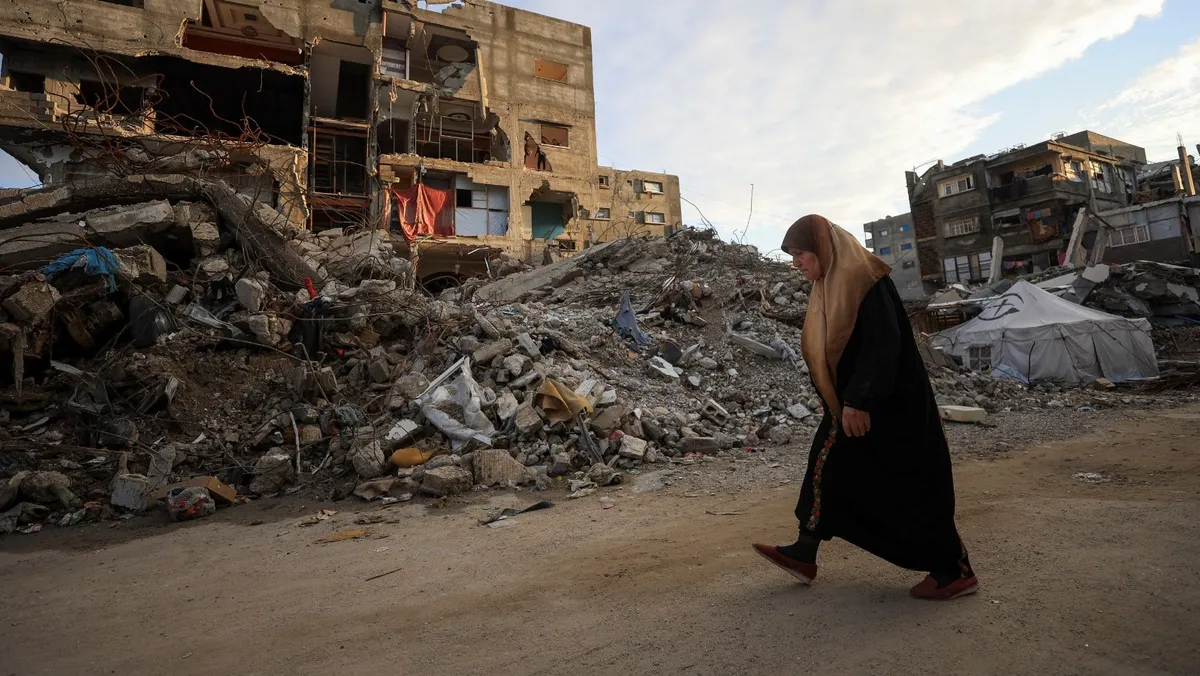 فلسطينية تمر بجوار مبان سكنية تضررت ودمرتها الغارات الإسرائيلية خلال الحرب في مدينة غزة. 14 ديسمبر 2025 - REUTERS
