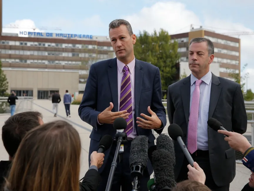 ناثان جيل عضو البرلمان الأوروبي السابق مع الصحافيين خارج مستشفى هوتبيير في ستراسبورج. 7 أكتوبر 2016 - REUTERS