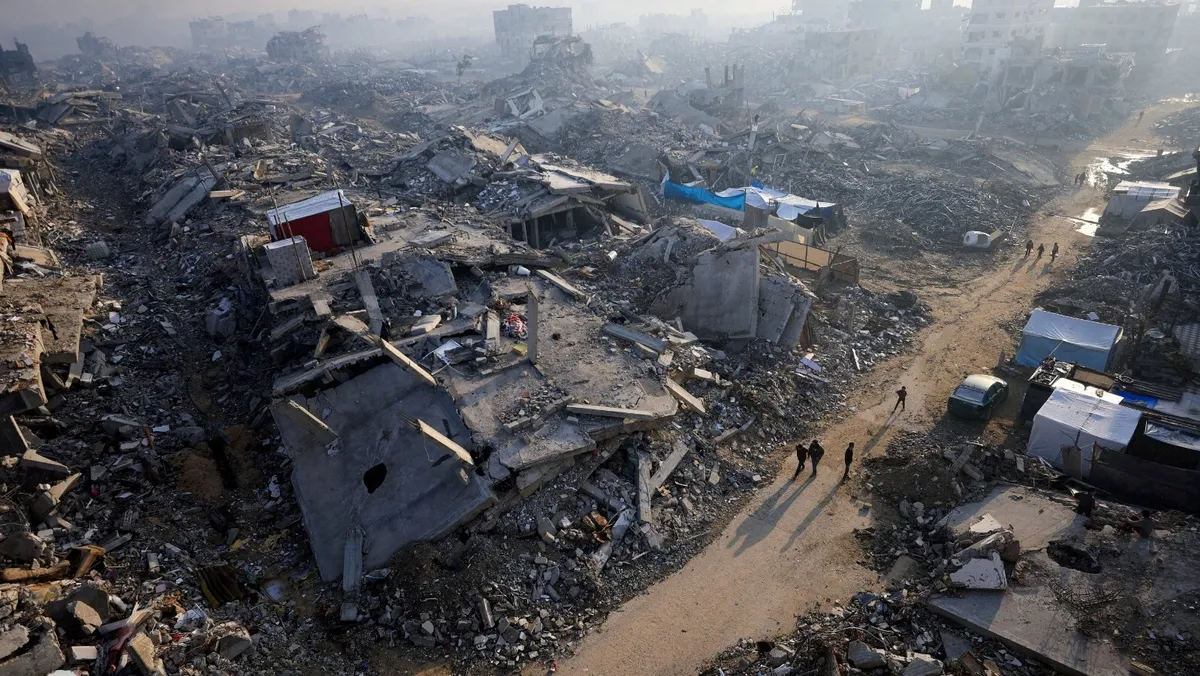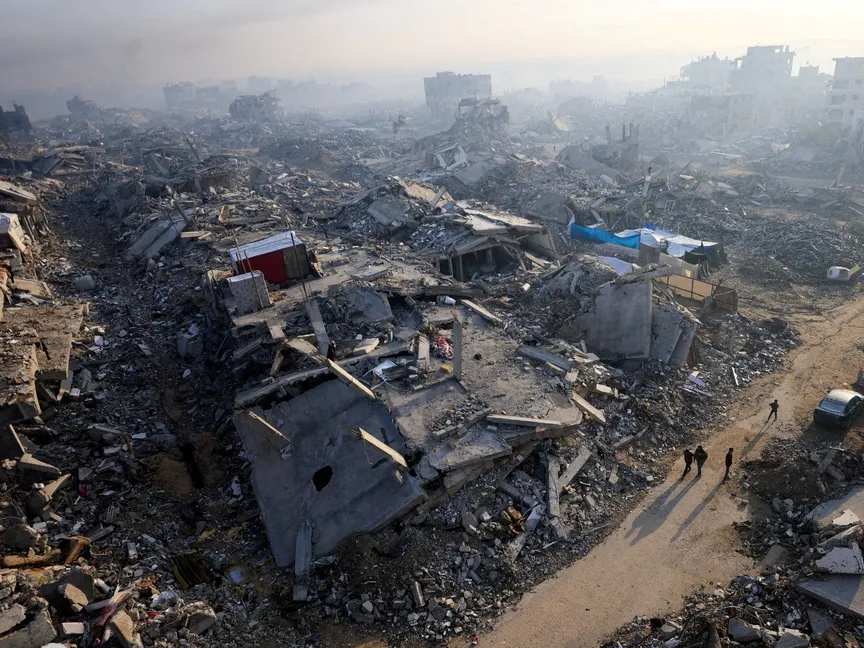 فلسطينيون يسيرون بين أنقاض مبان دمرها القصف الإسرائيلي في ن على قطاع غزة. 19 نوفمبر 2025 - Reuters