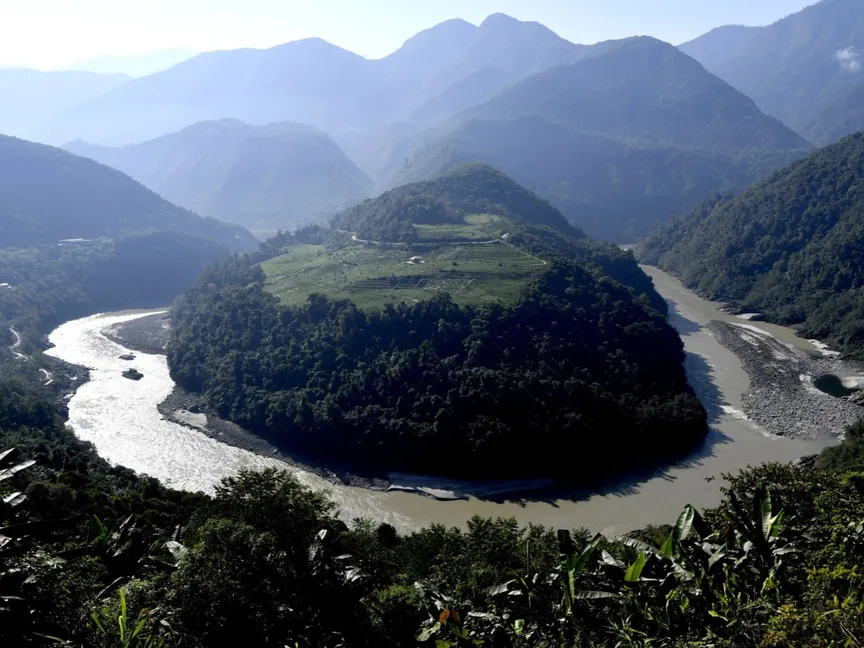 وفي اتجاه المصب من موقع السد، يمر النهر عبر ولاية "أروناتشال براديش" في شمال شرق الهند، وهي منطقة تطالب بها الصين، ويصب في أحد الأنهار الرئيسية في الهند، وهو نهر "براهمابوترا"، قبل أن يتدفق إلى بنجلاديش.