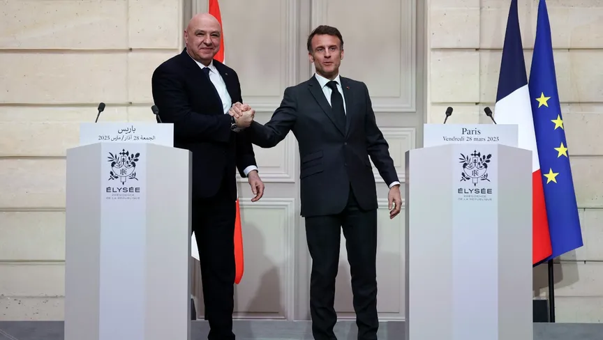 الرئيس الفرنسي إيمانويل ماكرون يصافح الرئيس اللبناني جوزيف عون خلال مؤتمر صحافي في قصر الإليزيه بالعاصمة باريس- 28 مارس 2025 - Reuters