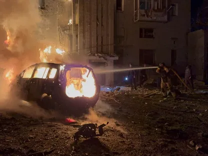 فرق الإطفاء تحاول السيطرة على حريق ناجم عن غارة روسية بطائرة مسيرة في بلدة أوختيركا بمنطقة سومي في أوكرانيا. 8 ديسمبر 2025 - via REUTERS