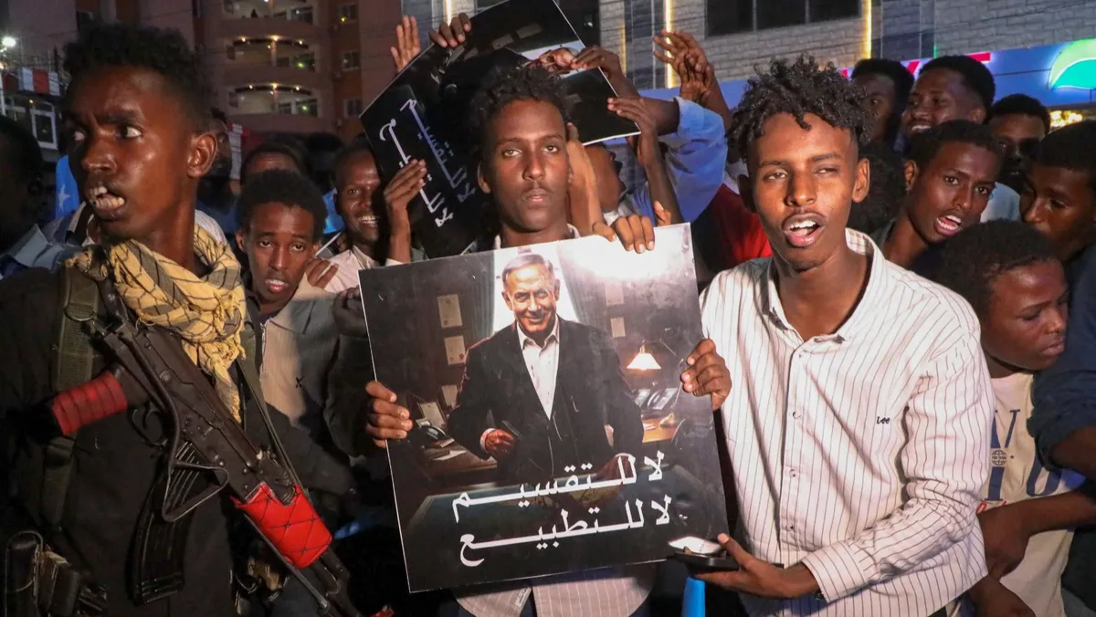 صوماليون يحملون صورة لرئيس الوزراء الإسرائيلي بنيامين نتنياهو خلال مظاهرة للتنديد باعتراف إسرائيل بجمهورية أرض الصومال المعلنة من جانب واحد كدولة مستقلة في مقديشو بالصومال. 28 ديسمبر 2025 - Reuters