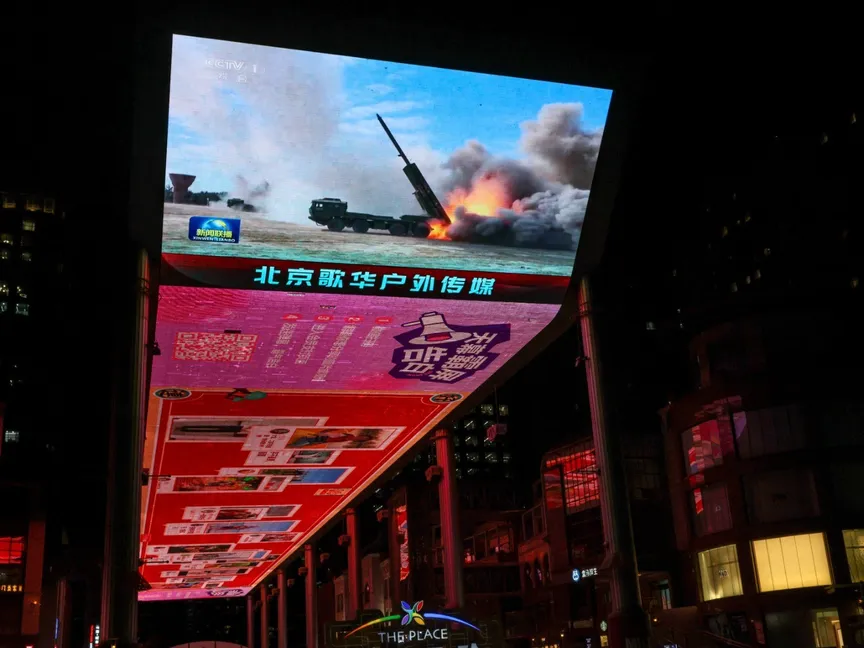 شاشة عملاقة تعرض تقريراً إخبارياً عن مناورات "مهمة العدالة 2025" العسكرية الصينية حول تايوان في بكين. 30 ديسمبر 2025 - REUTERS