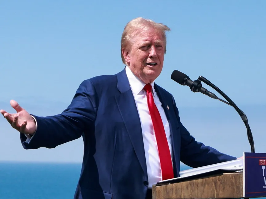 الرئيس دونالد ترمب خلال مؤتمر صحافي في نادي ترمب الوطني للجولف في مدينة رانشو بالوس فيرديس بولاية كاليفورنيا. 13 سبتمبر 2024 - REUTERS