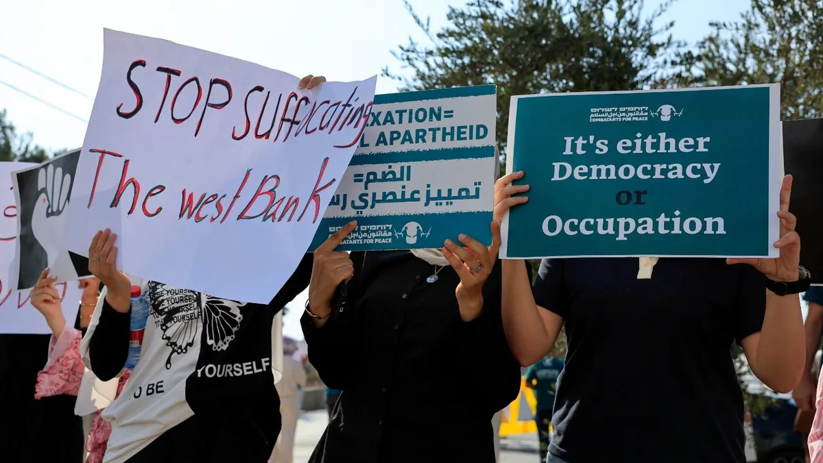متظاهرون يرفعون لافتات خلال احتجاج لنشطاء فلسطينيين وإسرائيليين بالقرب من بيت جالا في الضفة الغربية ضد مساعي إسرائيل لضم الضفة المحتلة. 5 سبتمبر 2025 - REUTERS