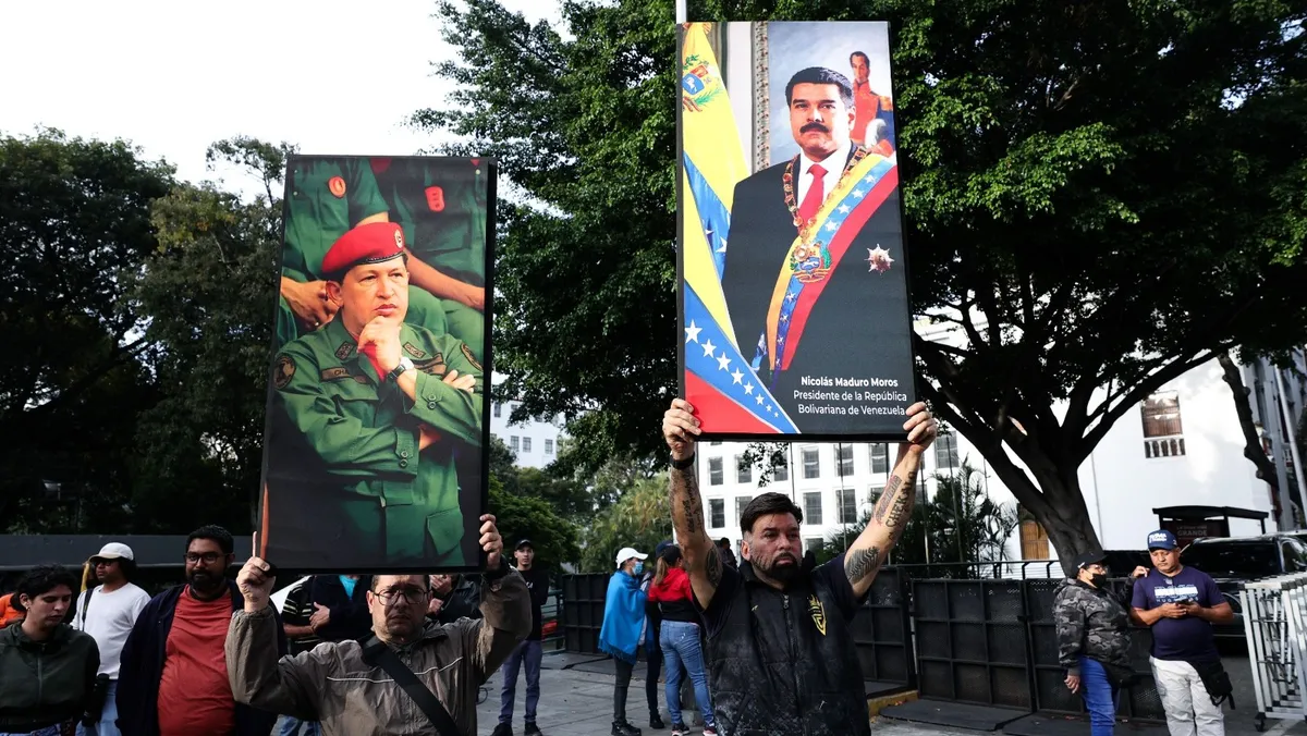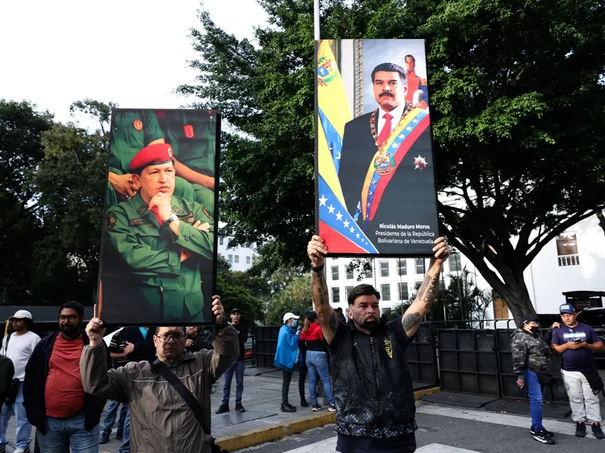فنزويلون يرفعون صور الرئيس نيكولاس مادورو والزعيم السابق هوجو تشافيز في وسط العاصمة كاراكاس في أعقاب الهجوم الأميركي على فنزويلا. 3 يناير 2026 - Reuters