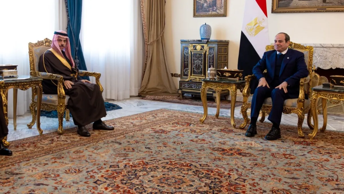 وزارة الخارجية السعودية، قالت إن الأمير فيصل بن فرحان، استعرض مع الرئيس المصري، "العلاقات الأخوية بين البلدين الشقيقين، ومستجدات الأوضاع على الساحتين الإقليمية والدولية".