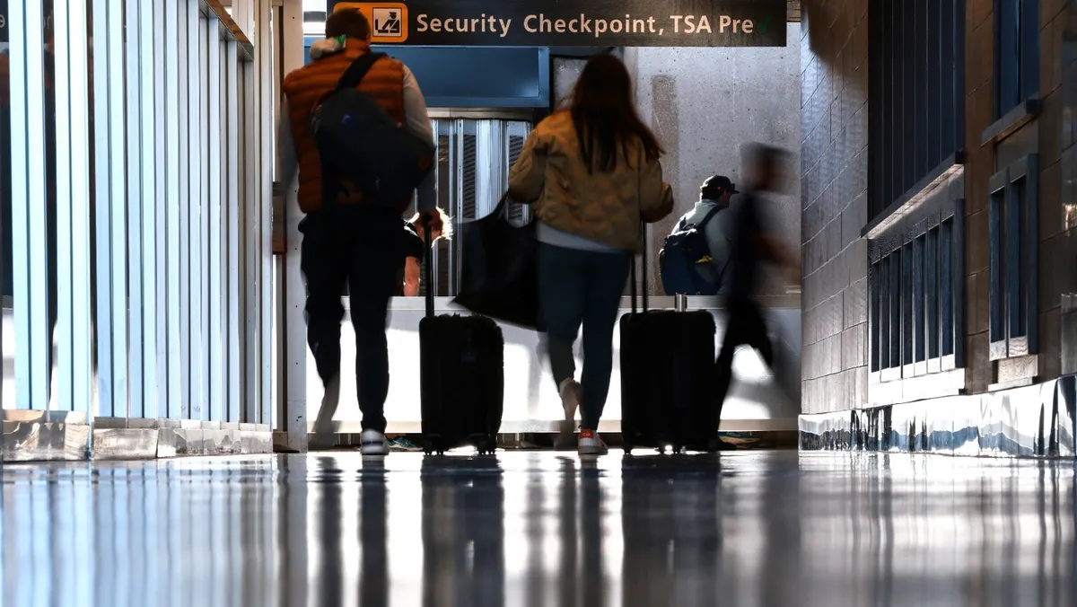 مسافرون أمام نقطة تفتيش أمنية في مطار دالاس الدولي في فيرجينيا بالولايات المتحدة. 13 نوفمبر 2025 - Reuters