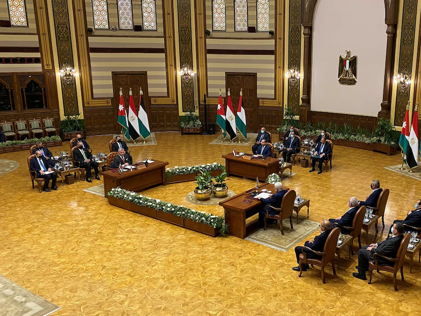 وانطلقت الخميس بمقر الرئاسة المصرية في العاصمة القاهرة، الخميس، أعمال القمة الثلاثية، التي جمعت الرئيس المصري عبد الفتاح السيسي، وملك الأردن عبد الله الثاني، والرئيس الفلسطيني محمود عباس، لبحث "تفعيل الدعم الدولي والإقليمي للقضية الفلسطينية".