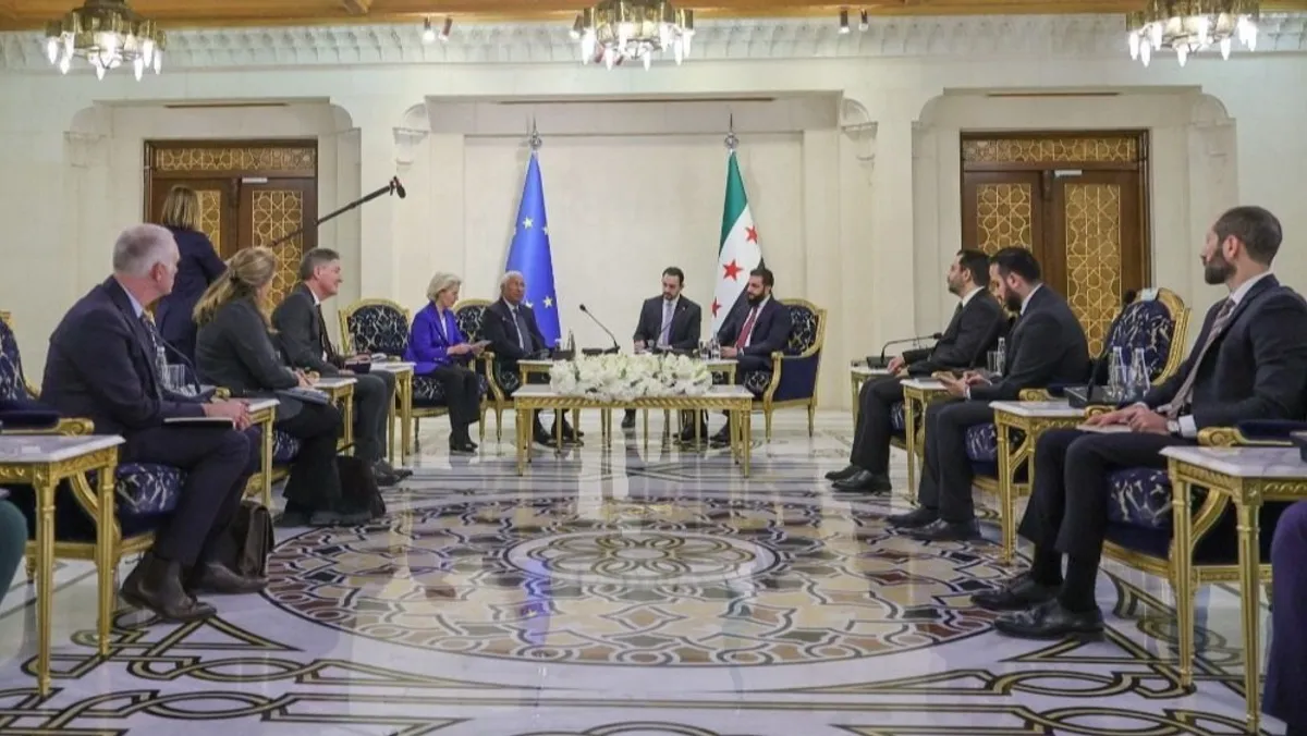 بحث الرئيس السوري أحمد الشرع، الجمعة، مع رئيسة المفوضية الأوروبية أورسولا فون دير لاين، ورئيس المجلس الأوروبي أنطونيو كوستا، في العاصمة دمشق، أهمية الحفاظ على وحدة الأراضي السورية، وسبل تطوير علاقات التعاون، فيما أعلن الاتحاد الأوروبي عن حزمة دعم مالي لدمشق بقيمة نحو 620 مليون يورو لعامي 2026 و2027.
