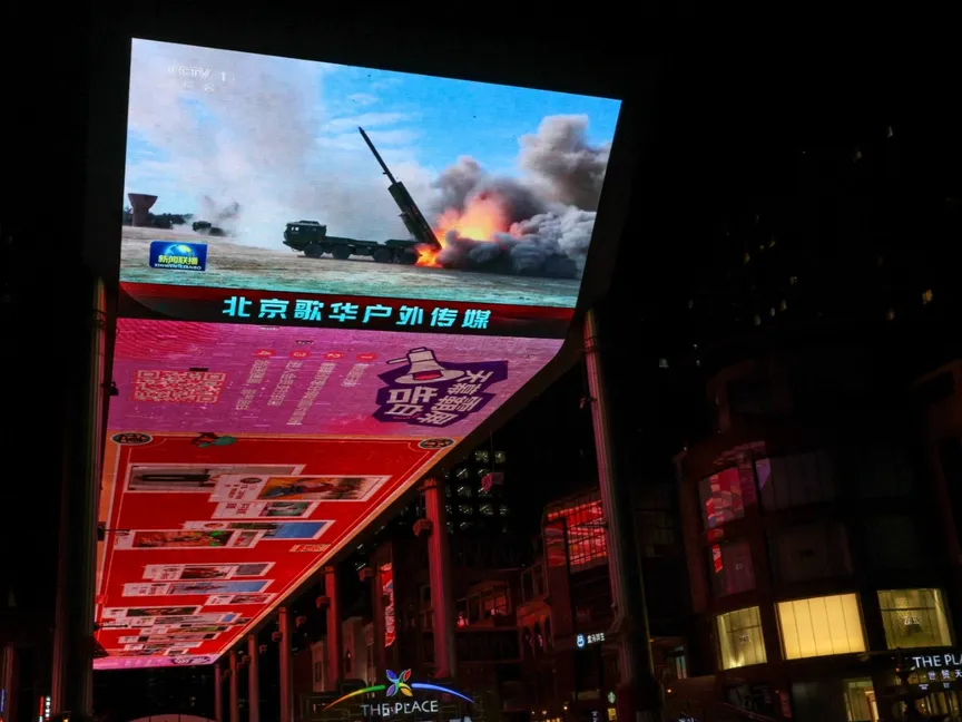 شاشة عملاقة في بكين تعرض تقريراً إخبارياً عن مناورات "مهمة العدالة 2025" العسكرية الصينية حول تايوان. 30 ديسمبر 2025 - REUTERS