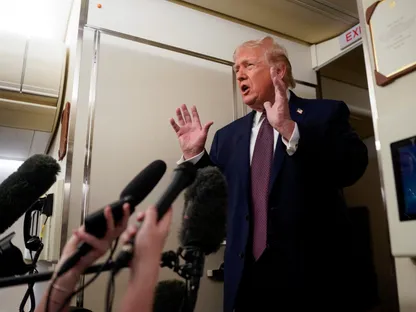 الرئيس الأميركي دونالد ترمب يتحدث مع الصحافيين على متن الطائرة الرئاسية (إير فورس وان) أثناء توجهه من فلوريدا إلى واشنطن، الولايات المتحدة. 11 يناير 2026 - Reuters