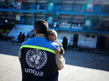 أحد أعضاء فريق الأونروا يحمل طفلاً مصاباً في مدرسة تم تحويلها إلى ملجأ في غزة. يناير 2024 - museothyssen.org