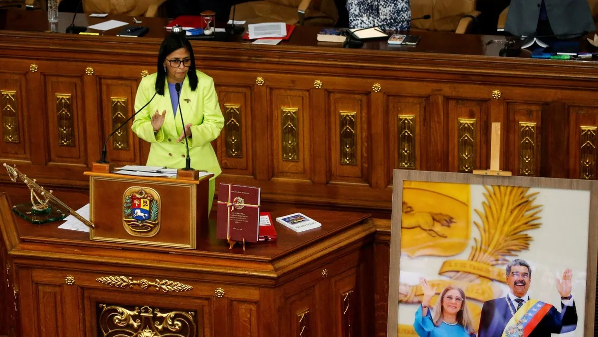 ورأت الوكالة أن رودريجيز تحاول المناورة بحذر بين مسارين متعارضين، فقد وُضعت إلى جانبها أثناء الخطاب صورة لمادورو وزوجته سيليا فلوريس، كما دعت الحكومة الأميركية إلى "احترام كرامة" مادورو، المحتجز في سجن بمدينة بروكلين بعد أن دفع ببراءته من تهم تتعلق بالاتجار بالمخدرات. وفي الوقت نفسه، قدّمت نفسها كمدافعة عن سيادة فنزويلا، بينما تتقارب بلادها مع واشنطن بوتيرة سريعة.