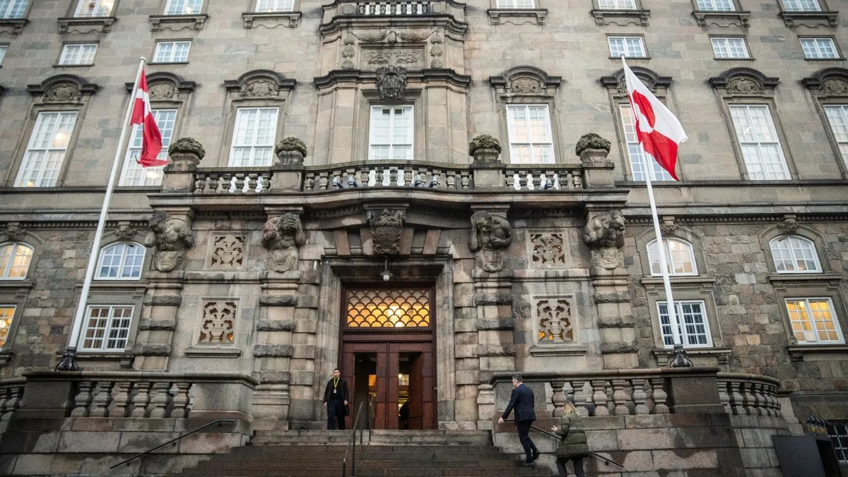 علم جرينلاند يرفرف على الدرج الرئيسي للبرلمان الدنماركي في كوبنهاجن. 16 يناير 2026 - Reuters