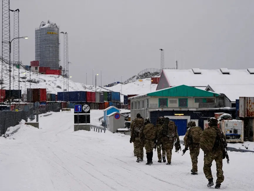 جنود دنماركيون يسيرون بعد نزولهم من سفينة في جزيرة جرينلاند. 18 يناير 2026 - REUTERS
