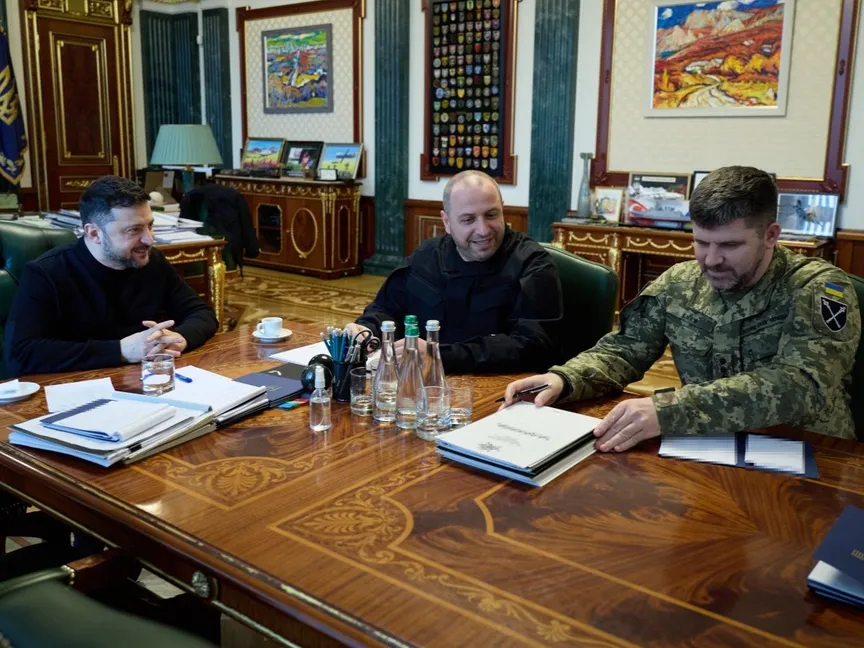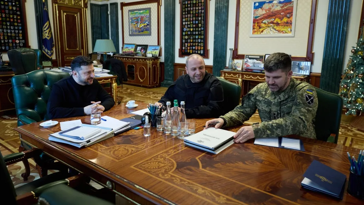الرئيس الأوكراني فولوديمير زيلينسكي خلال اجتماع مع رستم عمروف رئيس وفد التفاوض في الحرب الروسية ورئيس أركان الجيش أندرية هناتوف. 23 ديسمبر 2025 - @ZelenskyyUa