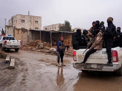 عناصر من قوات الأمن السورية يتجمعون في إحدى الآليات خارج سجن الأقطان، حيث يُحتجز عدد من معتقلي تنظيم داعش، في مدينة الرقة شمالي سوريا. 23 يناير 2026 - Reuters