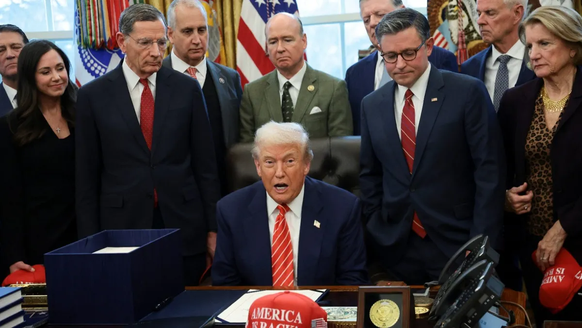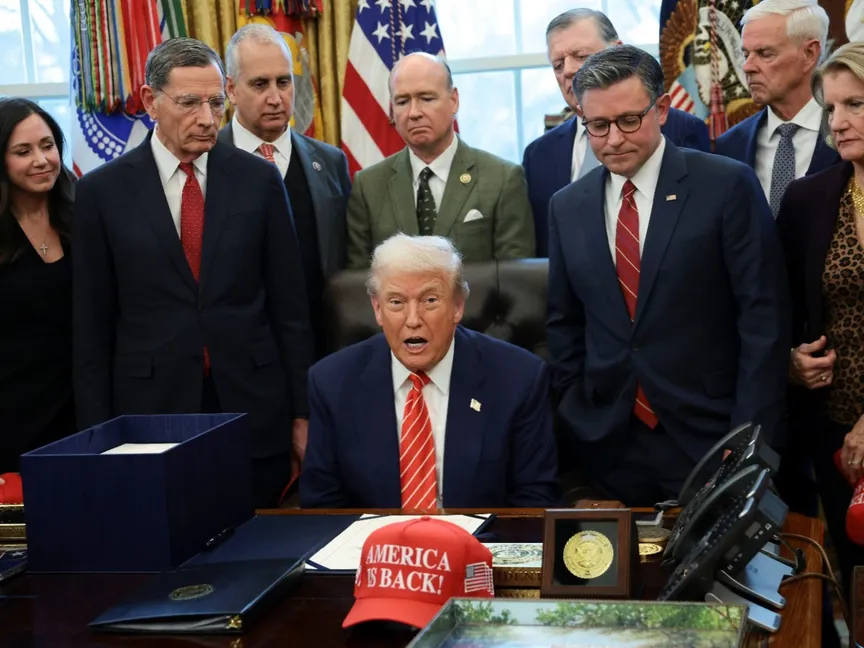 الرئيس الأميركي دونالد ترمب يقف إلى يساره رئيس مجلس النواب مايك جونسون وأعضاء من الكونجرس في البيت الأبيض. 3 فبراير 2026 - Reuters