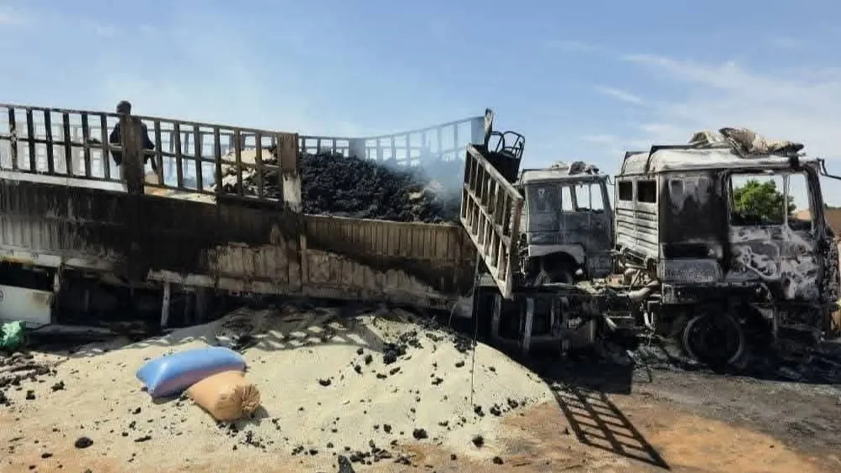 صورة متداولة لشاحنات إغاثة تابعة لمنظمة الغذاء العالمي بعد تعرضها لهجوم بطائرات مسيرة في ولاية شمال كردفان غربي السودان. 7 فبراير 2026 - x.com/sudan_war