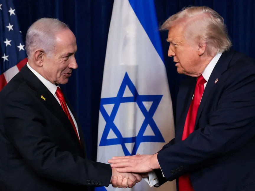 الرئيس الأميركي دونالد ترمب ورئيس الوزراء الإسرائيلي بنيامين نتنياهو يتصافحان خلال مؤتمر صحفي بعد لقائهما بنادي مارالاجو في بالم بيتش بفلوريدا في الولايات المتحدة. 29 ديسمبر 2025 - REUTERS