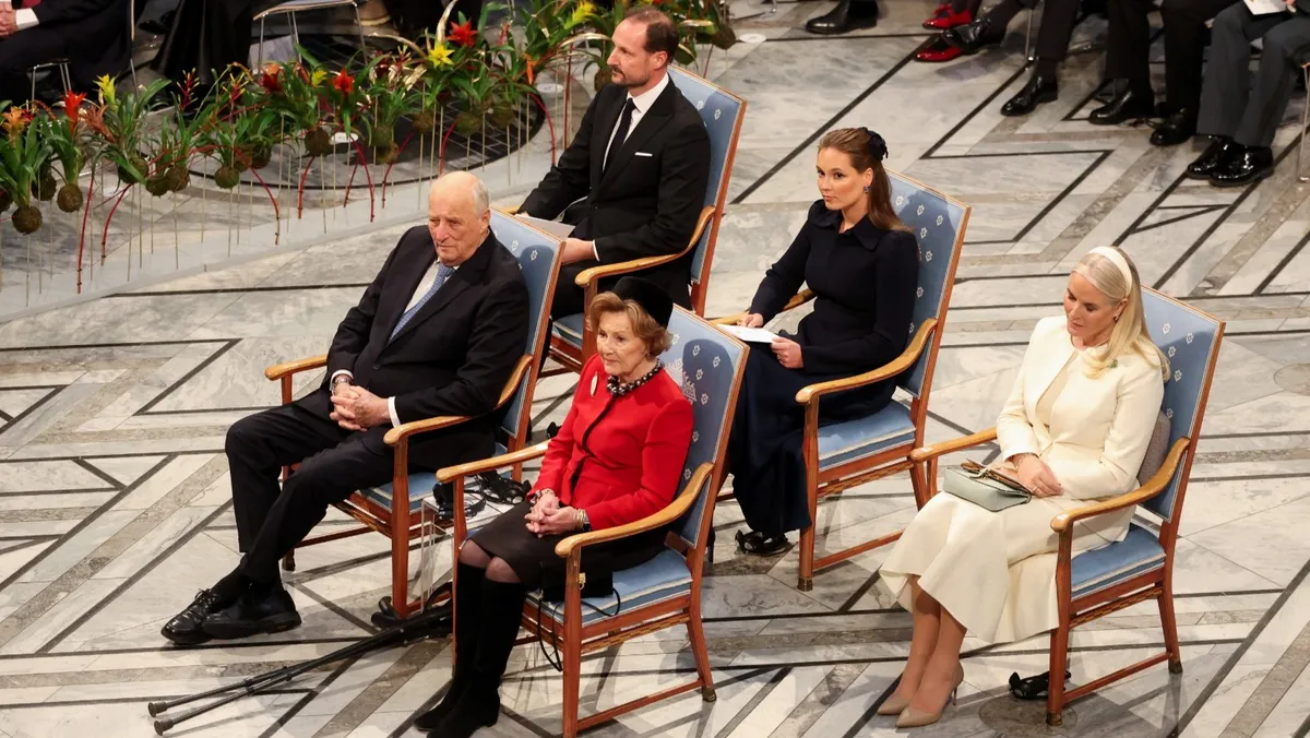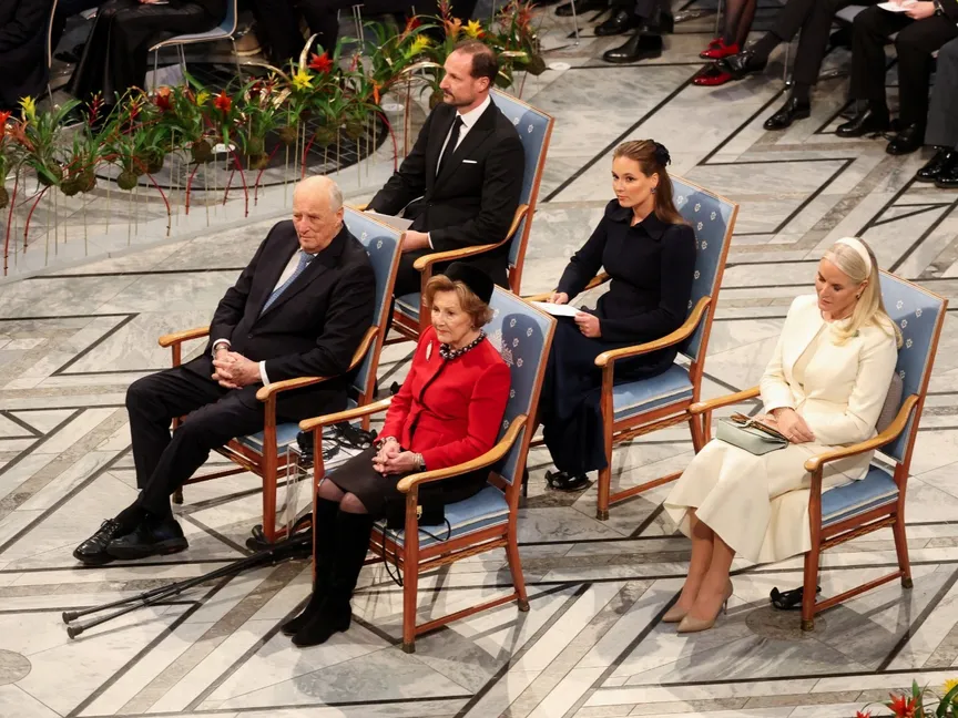 ملك النرويج هارالد الخامس والملكة سونيا وولي العهد هاكون وزوجته ميت ماريت والأميرة إنجريد ألكسندرا خلال حفل جائزة نوبل للسلام في العاصمة أوسلو. 10 ديسمبر 2025 - REUTERS
