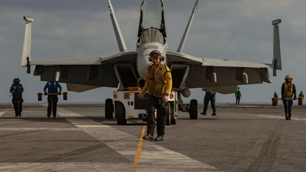 مقاتلة من طراز F/A-18E Super Hornet على سطح حاملة الطائرات جيرالد فورد المتجهة حالياً إلى الشرق الأوسط، 31 يناير 2024 - DeptofWar