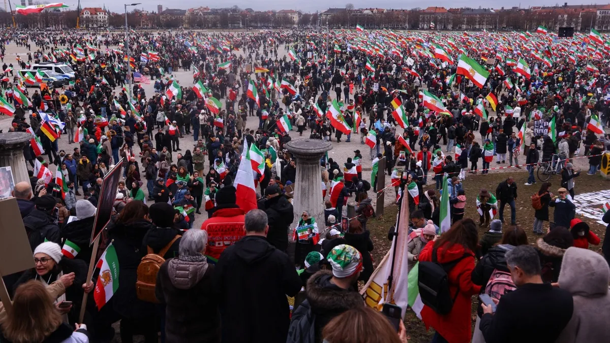 وقرع المتظاهرون الطبول، ورددوا هتافات تطالب بتغيير النظام، فيما شكّل التجمع الضخم والصاخب في ميونخ، جزءاً مما وصفه نجل شاه إيران السابق رضا بهلوي، الذي دعا إلى هذه التظاهرات، بـ"اليوم العالمي" لدعم الإيرانيين، على الرغم من أغلبية المتظاهرين لم يكونوا داعمين لعودة نظام الشاه.