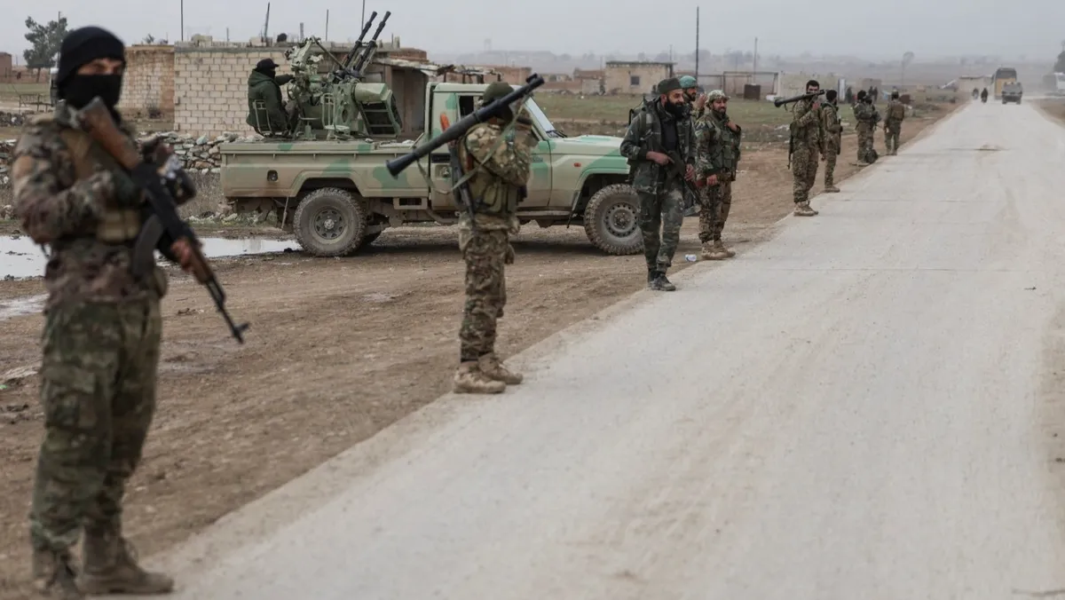 أفراد من الجيش السوري أمام نقطة تفتيش على مشارف مدينة الحسكة بشمال شرقي البلاد. 2 فبراير 2026 - Reuters