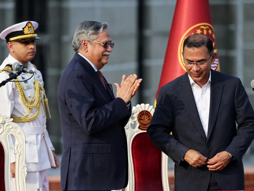 رئيس بنجلاديش محمد شهاب الدين يصفق أثناء أداء طارق رحمن اليمين الدستورية رئيساً للوزراء في الساحة الجنوبية لمبنى البرلمان. دكا في 17 فبراير 2026 - reuters