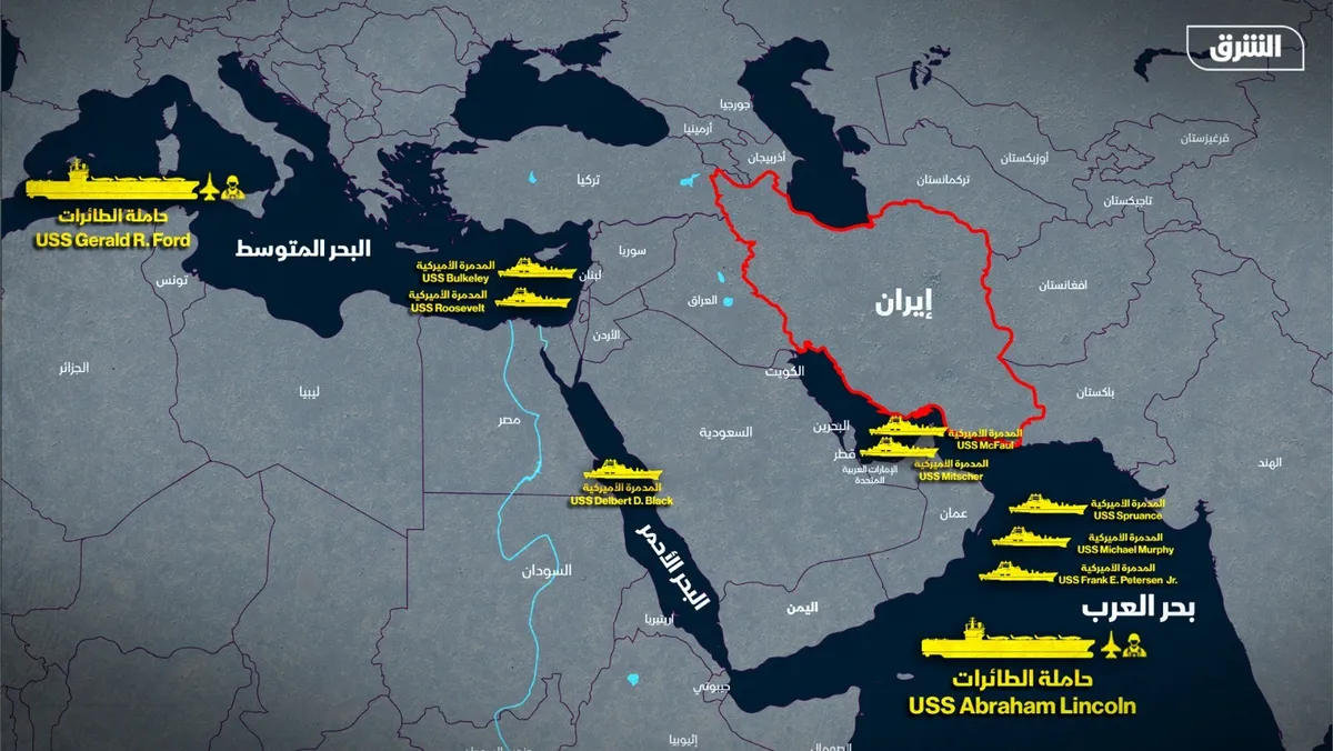 وتملك الولايات المتحدة ما لا يقل عن 12 سفينة حربية في منطقة الشرق الأوسط، بينها حاملة طائرات وثماني مدمرات، حسبما أعلنت البحرية الأميركية، إضافة إلى ثلاث سفن قتالية ساحلية جرى تحويلها إلى كاسحات ألغام، فضلاً عن حاملة طائرات أخرى تتجه عبر البحر المتوسط إلى المنطقة.