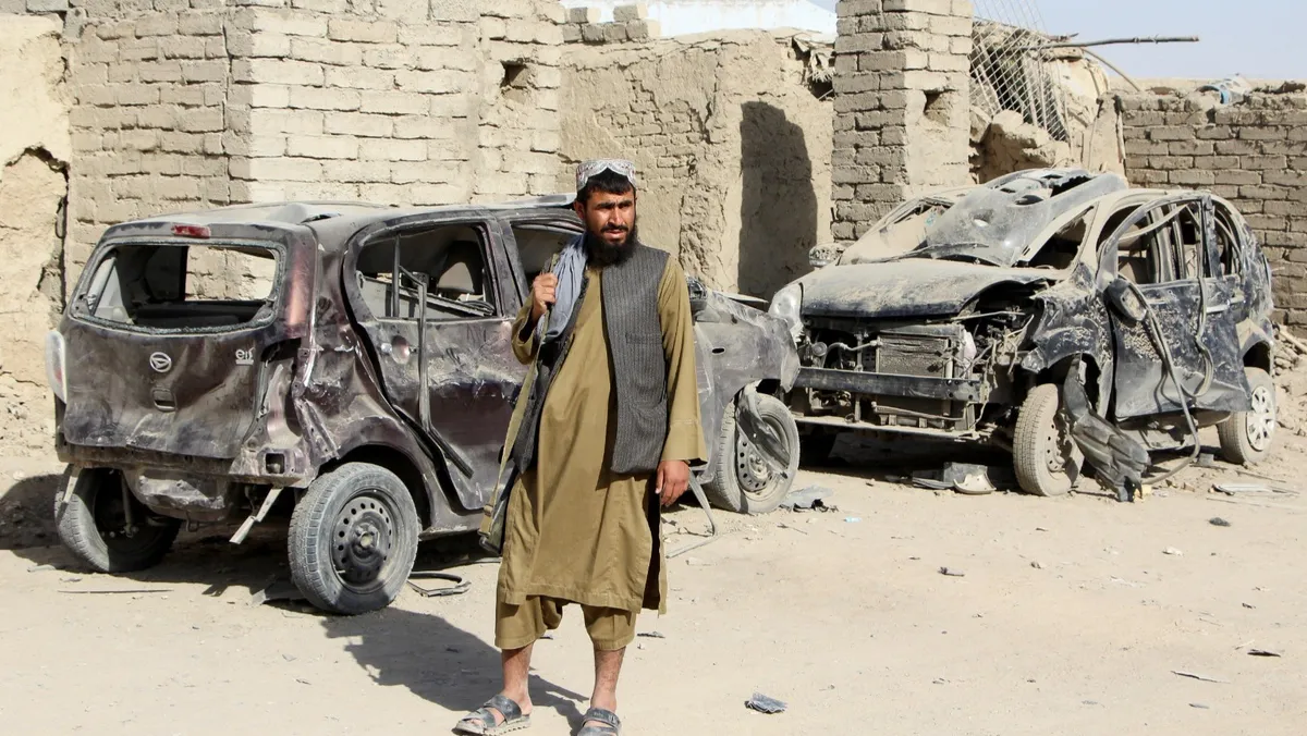مقاتل من طالبان يقف بجوار مركبات مدمرة جراء غارة جوية خلال الصراع بين أفغانستان وباكستان في منطقة سبين بولداك في ولاية قندهار بأفغانستان. 16 أكتوبر 2025 - Reuters
