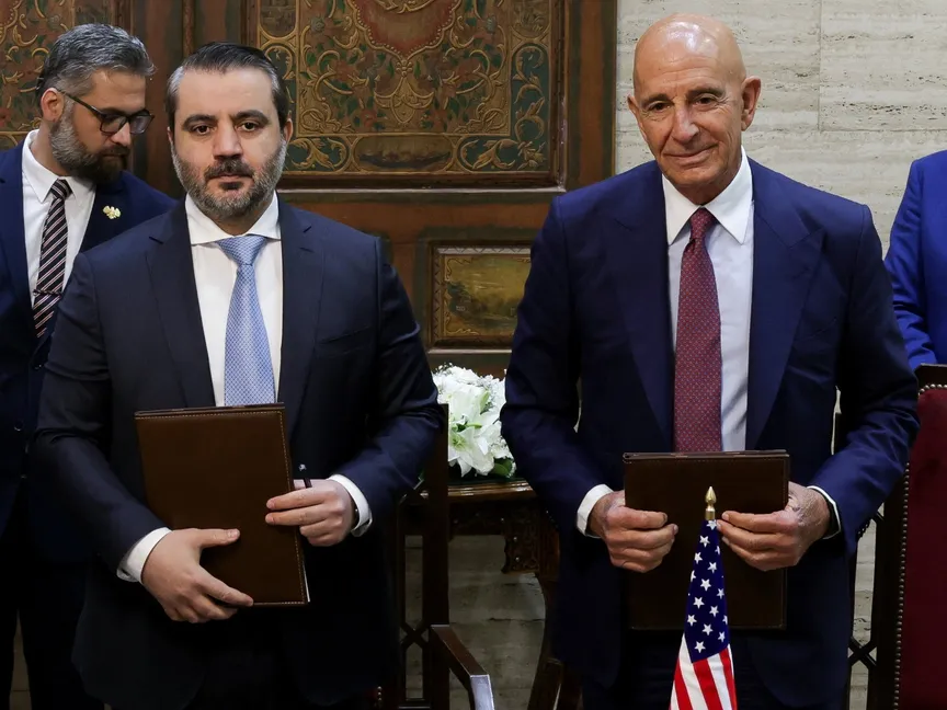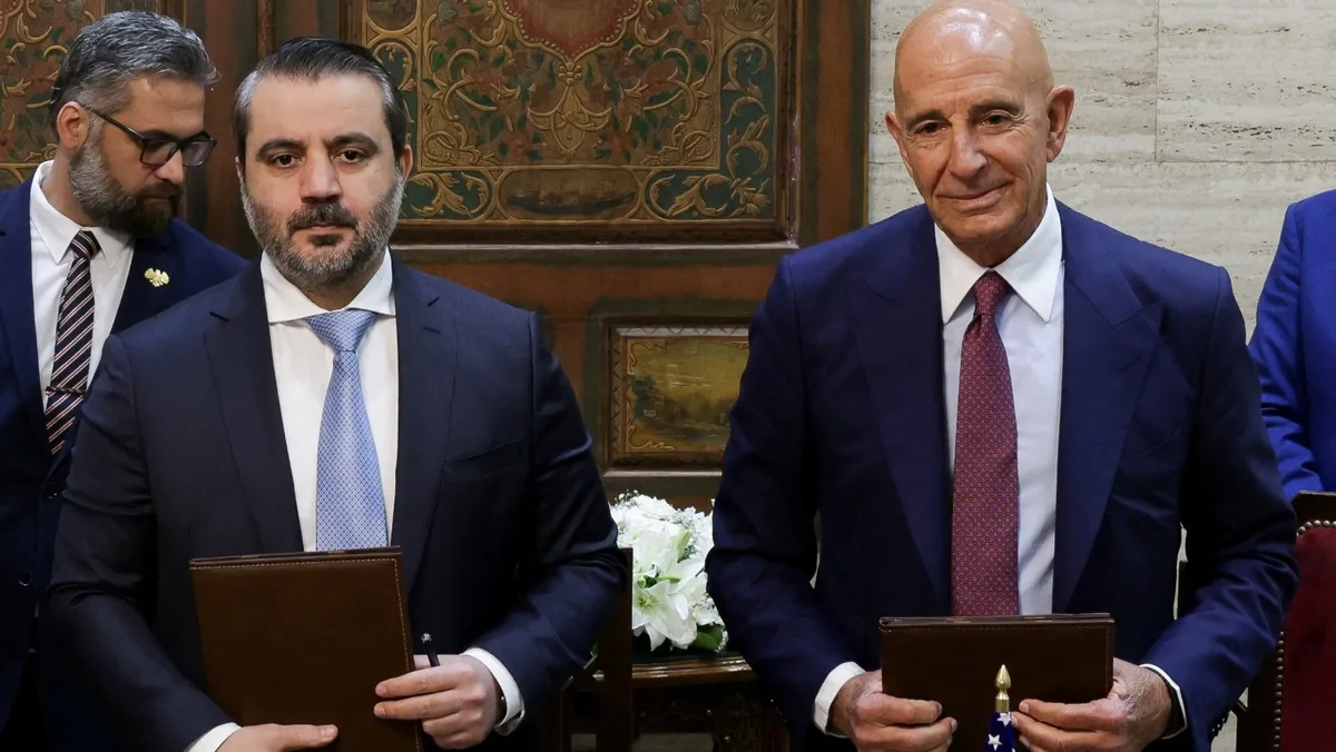 المبعوث الأمريكي الخاص إلى سوريا توم باراك ووزير الخارجية السوري أسعد الشيباني في دمشق. 16 سبتمبر 2025 - Reuters