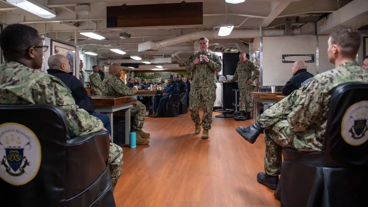 الجنرال فريد كاشر على متن حاملة الطائرات رونالد ريجان خلال إشرافه على الأسطول السابع الأميركي. 13 أبريل 2024 - @US7thFleet