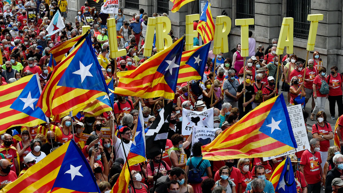 متظاهرون يلوّحون بأعلام مؤيّدة لاستقلال كاتالونيا ويرفعون كلمة "حرية" خلال مسيرة في برشلونة، 11 سبتمبر 2021 - AFP