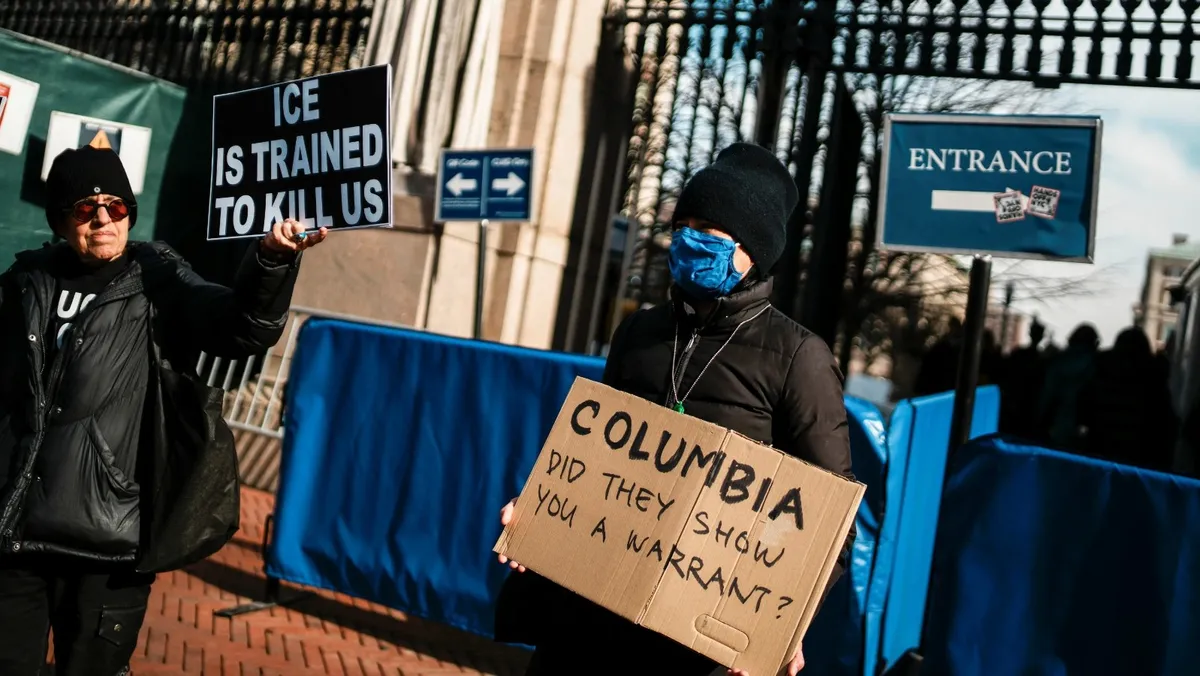 ألقت إدارة الهجرة والجمارك الأميركية القبض على طالبة بجامعة كولومبيا فجر الخميس، مما أثار احتجاجات في الحرم الجامعي وادعاءات بأن عناصرها دخلوا سكن الطلاب التابع للجامعة متنكرين بزي ضباط شرطة يبحثون عن طفل مفقود، حسب ما أوردت وكالة "أسوشيتد برس".