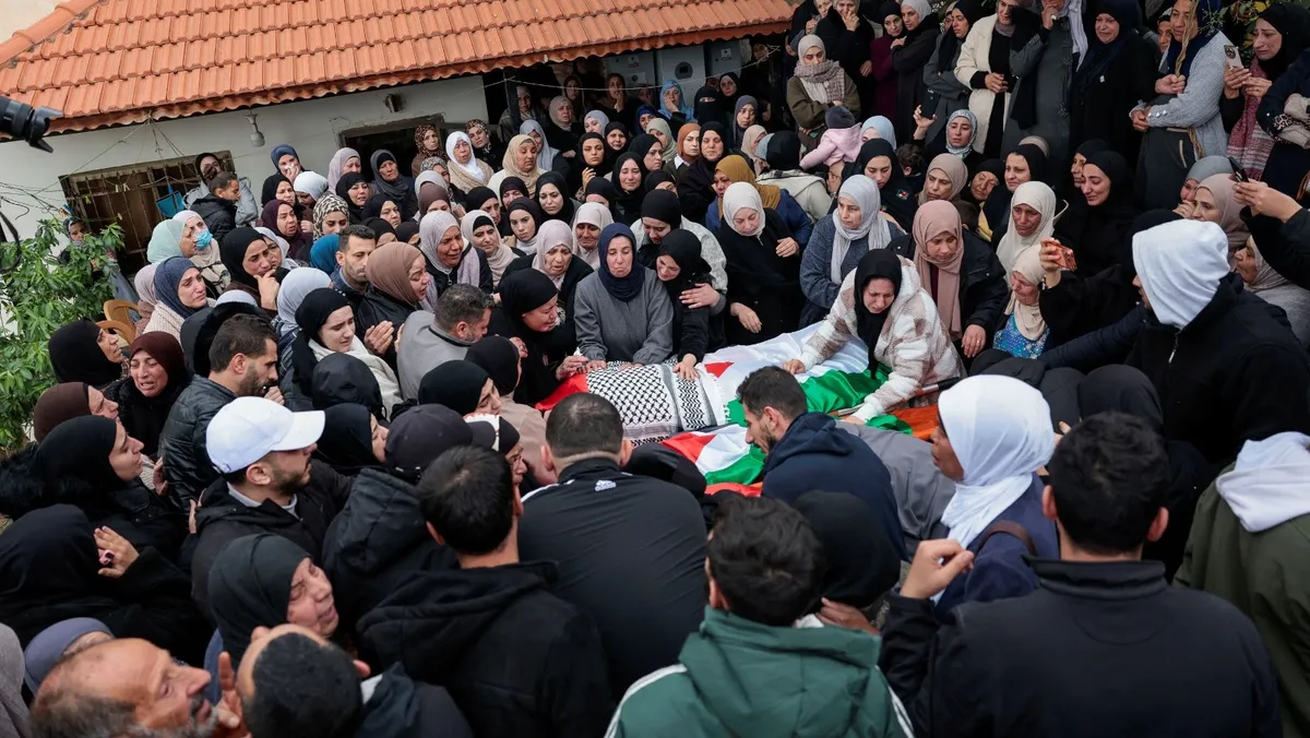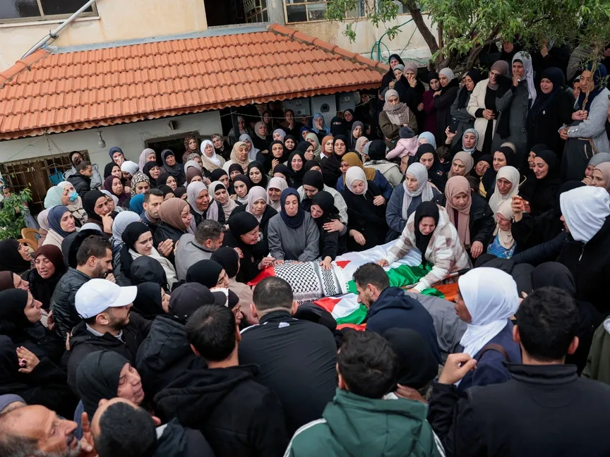 مشَيّعون يحملون جثامين عائلة فلسطينية قتلها الجيش الإسرائيلي في بلدة طمون قرب طوباس بالضفة الغربية المحتلة. 15 مارس 2026 - Reuters