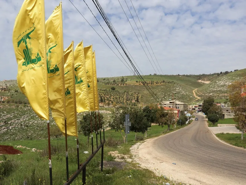 أعلام حزب الله في إحدى قرى قضاء مرج عيون بالجنوب اللبناني - REUTERS