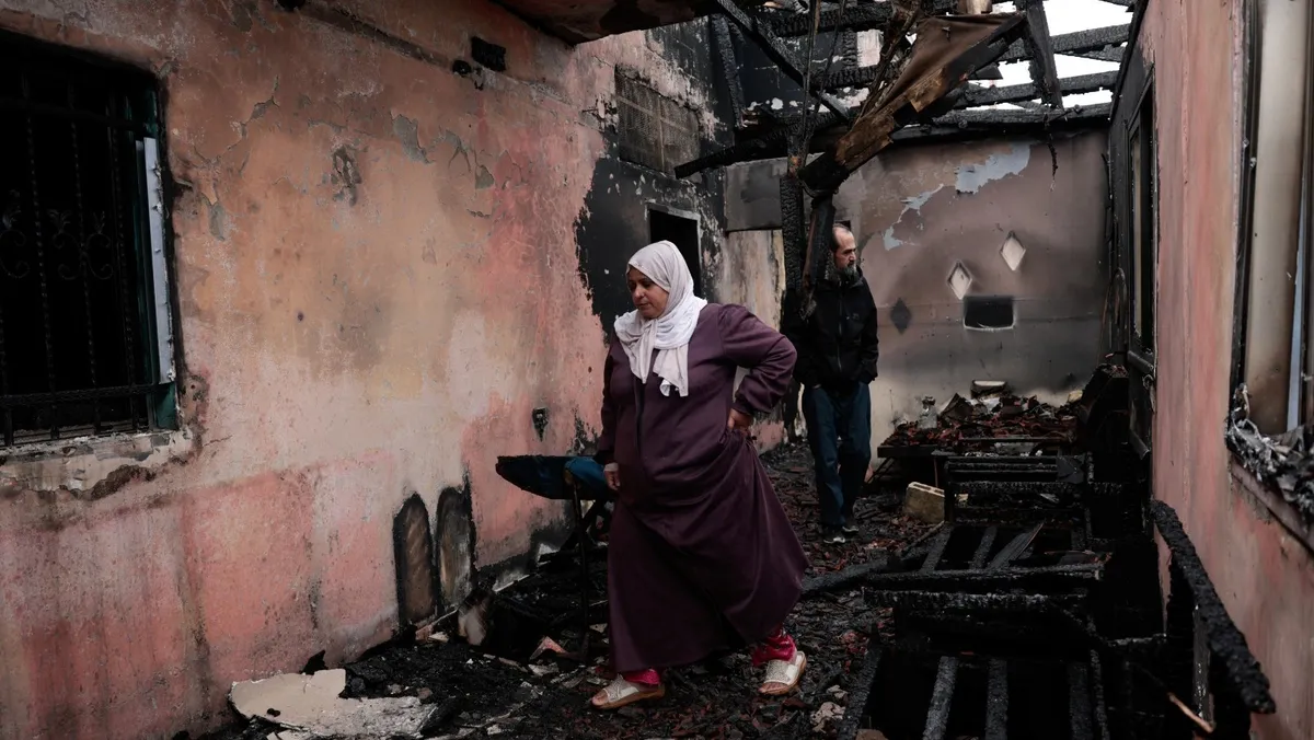 فلسطينيان يتفقدان منزلاً متضرراً بعد أن أضرم فيه مستوطنون إسرائيليون النيران في قرية الفندقومية قرب جنين بالضفة الغربية المحتلة. 22 مارس 2026 - REUTERS