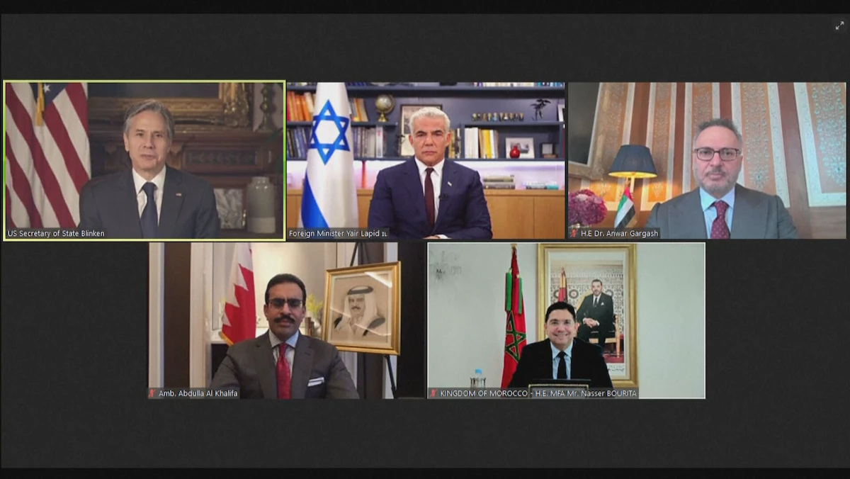 دعا وزير الخارجية الأميركية أنتوني بلينكن الجمعة، دولاً عربية أخرى إلى التطبيع مع إسرائيل، وذلك خلال لقاء عبر الإنترنت مع وزيري خارجية المغرب وإسرائيل، بالإضافة إلى السفير البحريني لدى واشنطن والمستشار الدبلوماسي لرئيس دولة الإمارات، بمناسبة الذكرى السنوية الأولى لتوقيع "اتفاقات أبراهام" للسلام.