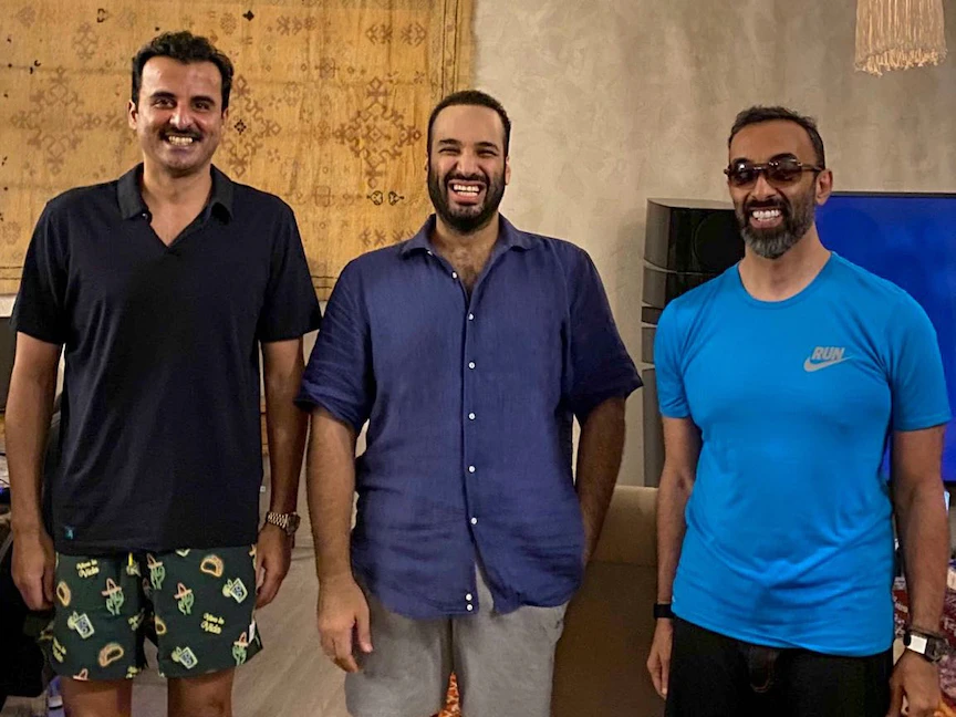 ونشر بدر العساكر، مدير المكتب الخاص لولي العهد السعودي، صورة تجمع الأمير محمد بن سلمان والشيخ تميم بن حمد والشيخ طحنون بن زايد، واصفاً اللقاء الذي جرى في البحر الأحمر بـ"الودي والأخوي".