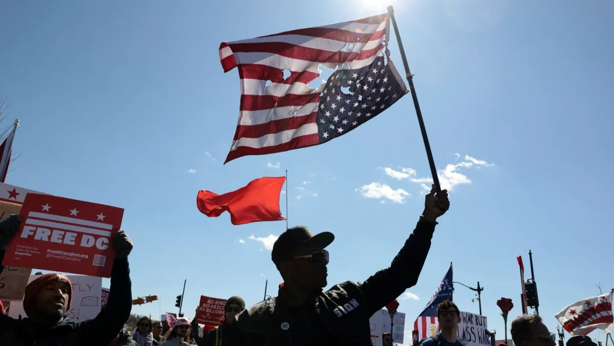 خرج متظاهرون إلى الشوارع في أنحاء الولايات المتحدة، السبت، تنديداً بسياسات الرئيس دونالد ترمب وإدارته، والتي يصفونها بأنها "استبدادية ومناهضة للديمقراطية"، من خلال حملته الصارمة على الهجرة، واستمرار الحملة العسكرية التي يشنها ضد إيران دون تحديد إطار زمني لنهايتها.